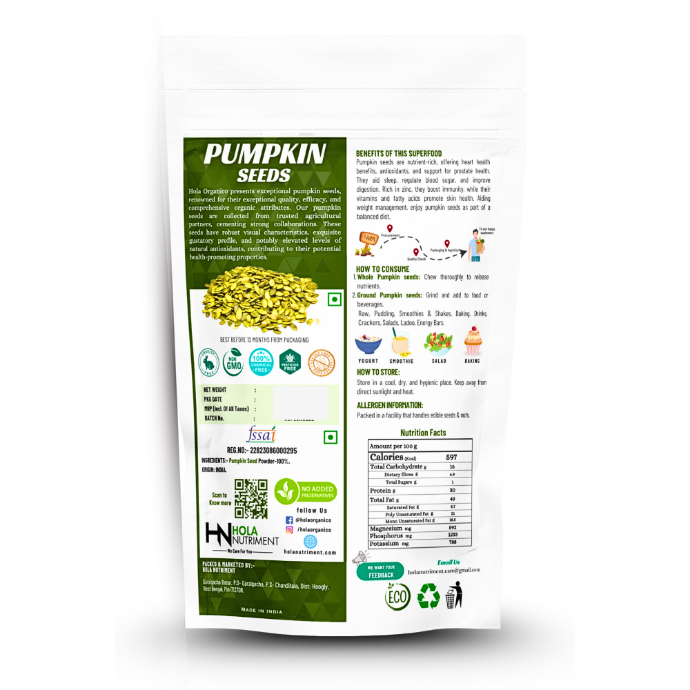 Discover the wholesome goodness of Hola Organico Pumpkin Seeds, nature’s perfect snack. Harvested from organically grown pumpkins, our seeds are a nutritional powerhouse, packed with essential vitamins, minerals, and antioxidants to fuel your day