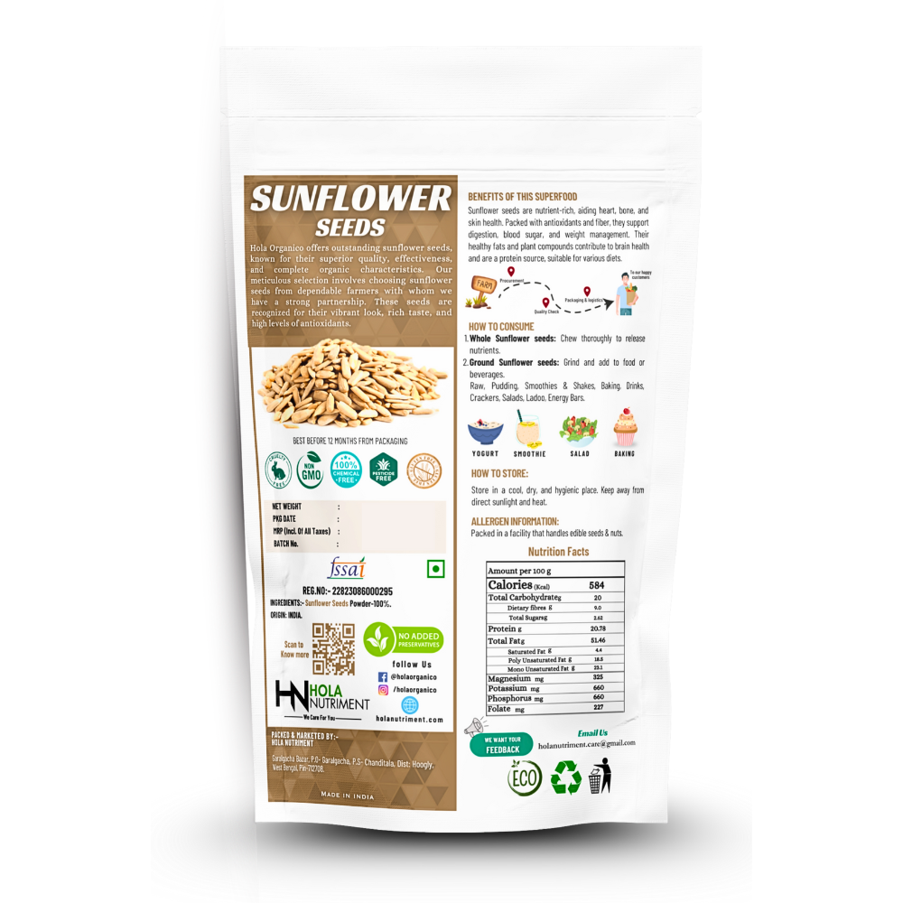 Hola Organico Sunflower Seeds offer premium, organic goodness for a natural energy boost. Handpicked from top organic farms, our seeds are perfect for a wholesome snack or a nutritious addition to your favorite recipes.