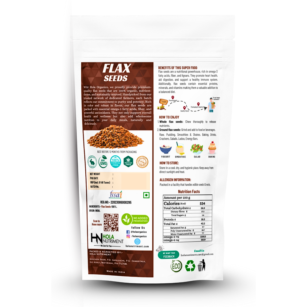 Hola Organico Premium Flax Seeds offer natural nutrition and vitality. Harvested from certified organic farms, these seeds are rich in Omega-3s, fiber, and lignans, supporting heart health and digestion.